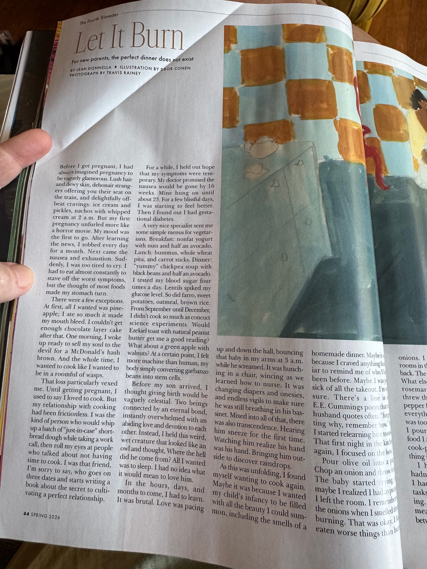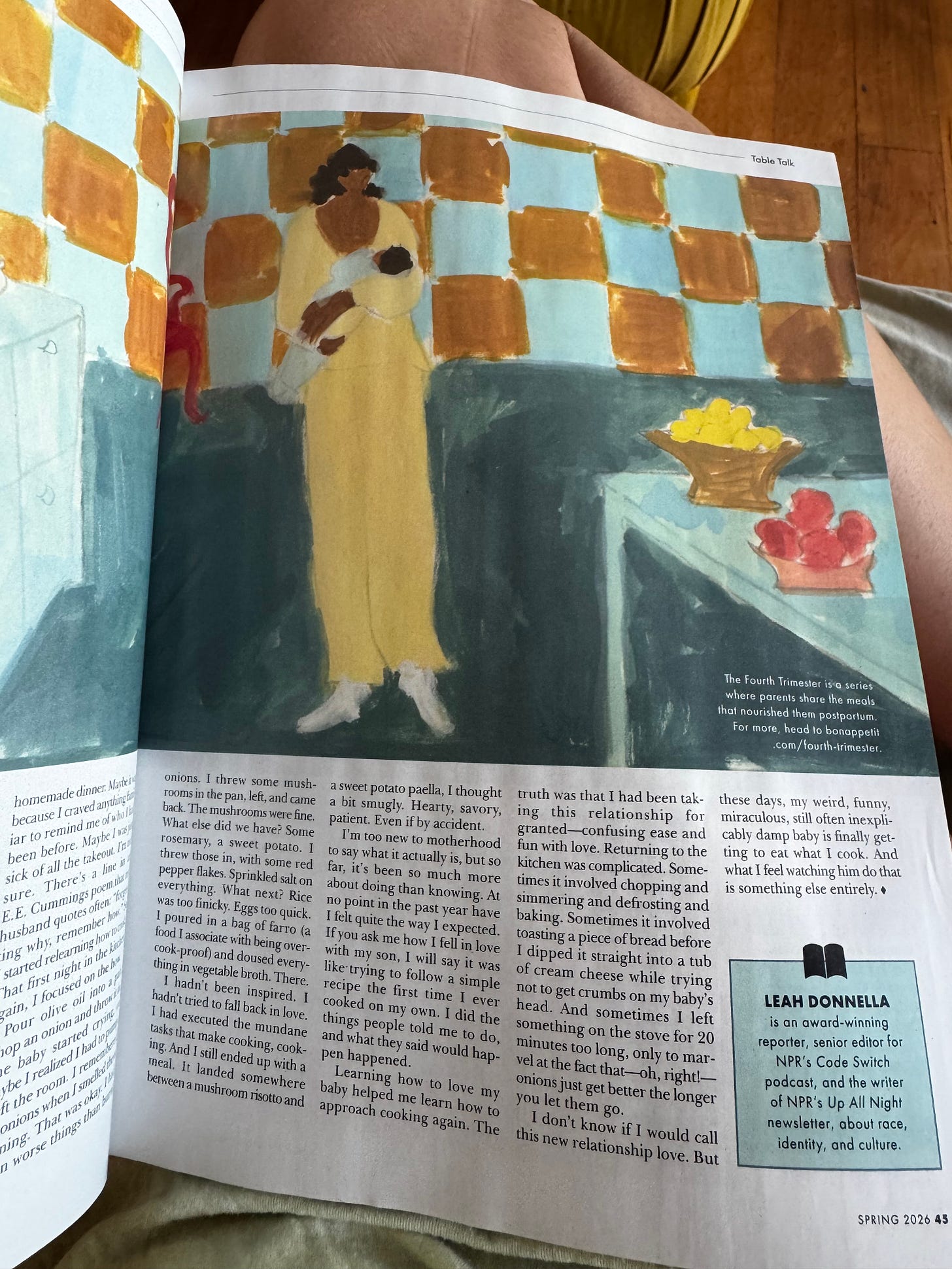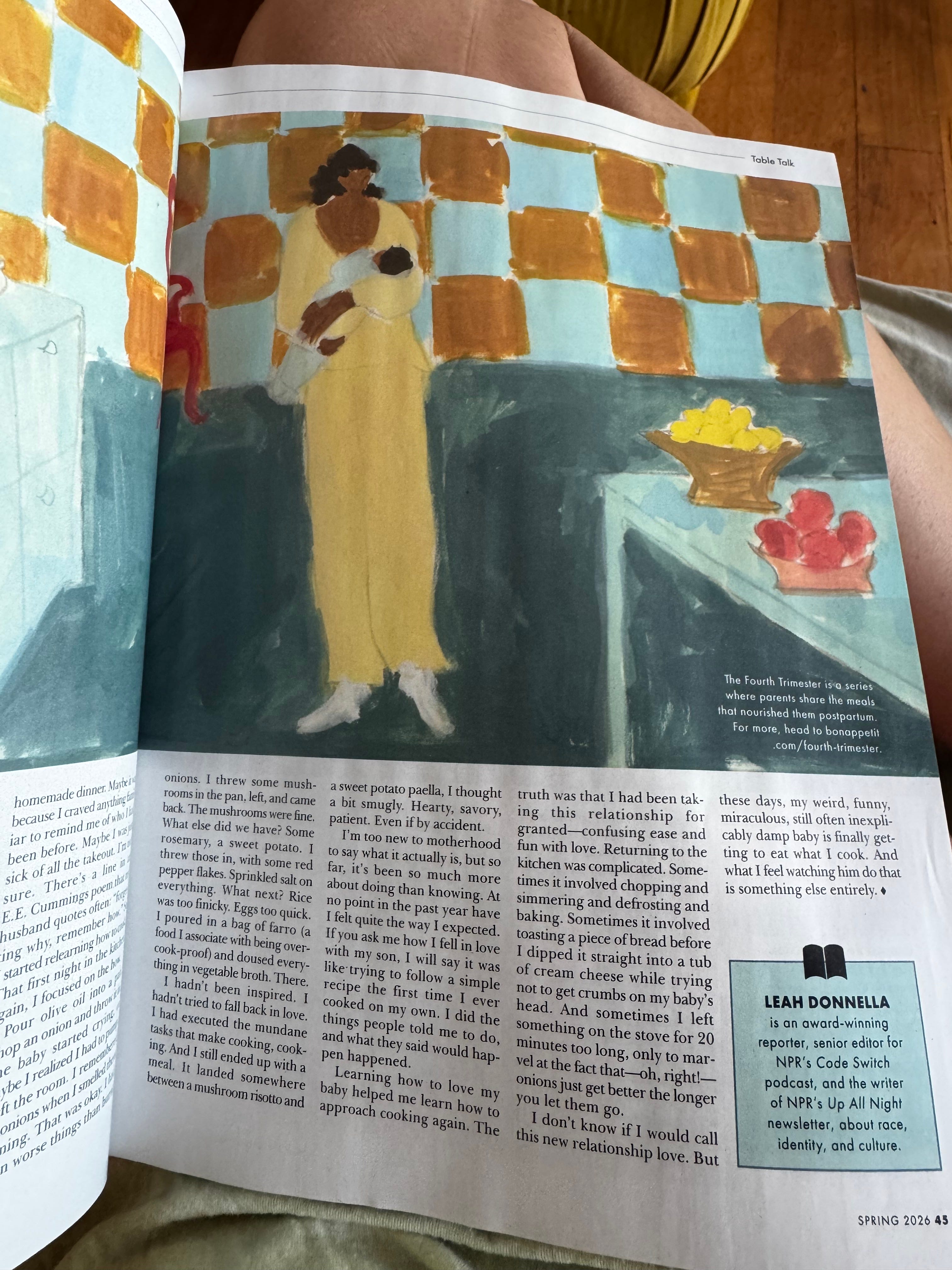 It’s a piece about how when she had her son, her urge to cook and do things that once brought her joy were ripped away by the survivalness of new motherhood. How familiar. I used to love to cook. I am still groping through the dark to find my way back to that and to even unearth the novelty of cooking for myself—just because…how can I expect someone to care for me if I can’t?